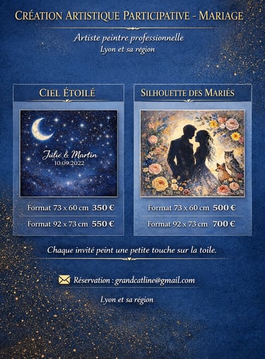 Je prépare la toile en amont, je guide les invités le jour J, puis je finalise l’œuvre en atelier pour un rendu harmonieux et professionnel.