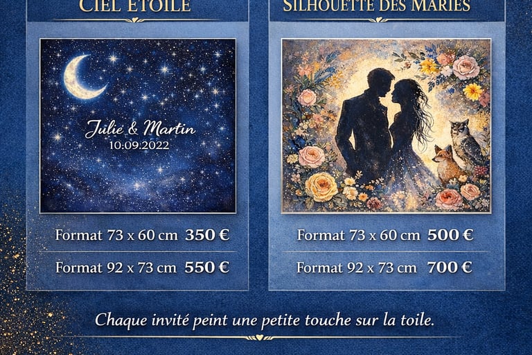 Chaque invité peint une étoile, une touche lumineuse ou un éclat dans le ciel. Petit à petit, la toile s’illumine au fil de la soirée.